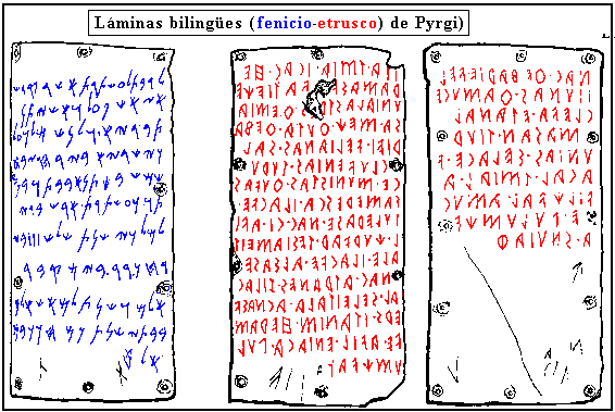 Gli studiosi, comunque, si sarebbero risparmiati molto lavoro se solo avessero considerato testimoni veritieri Virgilio e Omero, invece di trattarli da puri novellatori. Già Heinrich Schliemann aveva dimostrato che non lo erano per nulla. Gheorghiev l'ha riconfermato. Peccato, dunque, che non si sia trovato un poeta deciso a illustrare in maniera di favola l'incontro tra etruschi e cartaginesi; poiché, in questo caso, ne sapremmo un po' di più sull'argomento (siamo proprio sicuri che nessuno ci abbia pensato? Abbiamo provato con Virgilio, e la "nuova Eneide" di Maleuvre? Non è forse Giunone - l'Astarte fenicia, e non l'Era greca - che garantisce narrativamente, così prefigurando anche storicamente, l'incontro-scontro tra Cartaginesi/Latini ed Etruschi/Troiani? E' solo una coincidenza - cf. En. VII, 647 ss. - che i guerrieri della città di Agilla - "antico nome di Cere, l'odierna Cerveteri", Canali - siano gli unici Etruschi a schierarsi con Turno? ndc). [...] Nel 1964, essi (gli archeologi, ndc) trovarono a Santa Severa (cittadina marittima sita 40 km. a nord della foce del fiume Tevere, ndc) - l'antica Pyrgi - un'iscrizione in lingua cartaginese ed etrusca, nella quale un principe Thefarie Velianas (o Veliunas) annuncia la fondazione di un santuario di Astarte (o Tanit, la Giunone fenicia, e la Divinità prediletta di Elissa/Didone, ndc): "Poiché la mano della dea m'ha incoraggiato". Chi fosse codesto Velianas, resta oscuro. Era forse un etrusco legato alla città marinara, della quale aveva assunto gli dèi. Se così fosse, si dovrebbe dedurre che i cartaginesi ebbero il ruolo dominante nel concerto europeo-africano. Essi avrebbero assegnato agli alleati determinate zone d'influenza, riservandosene altre fra cui, anzitutto, le vie marine.