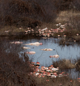 maculati di bianco, e sul quale galleggiavano numerose carogne.