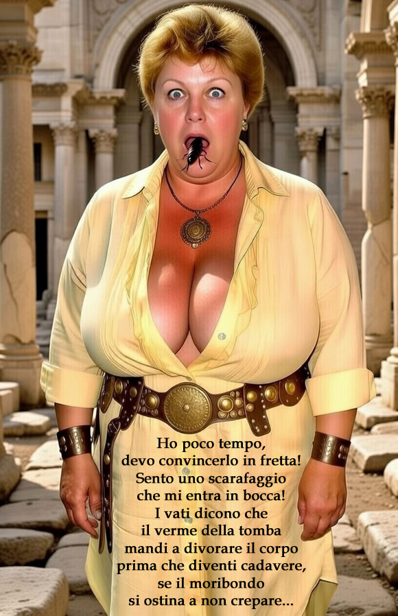 «Può anche darsi che io scriva un dramma per raccontare la sua morte ai Romani... Aggiungerò qualche dettaglio, spero non vi offenderete... Ho già qualche parola in mente...». Mentre moriva, rimpiangeva che il Sommo Figlio non fosse lì a vederla, sborchiata per l'ultima volta. Il trucco del cuscino non era riuscito. Ora cosa avrebbe inventato? Il ferro le era finito dietro la schiena, benché non fosse certo magra. Nessuno aveva il permesso di soccorrerla, perciò rimase a pancia sotto, sopra al cuscino stesso, con il grosso culo in fuori. La paura era tanta, d'altronde lei stessa si era suicidata, chi poteva incolpare del crimine? Accadde per questo motivo qualcosa di orribile, che colpì molto i presenti (guardie, amanti, schiavi e squallidi curiosi). La nobile Agrippina si pisciò sotto, anzi - a causa della sua anomala posizione e degli spasmi d'agonia che le avevano sollevato la tunica sopra il culo - spruzzò di augusto piscio tutto intorno, generando panico, ma anche libidine. Poi fu la volta di un'imperiale cagata. La paura di morire era troppa. Gli schiavi guardarono supplici le guardie, per capire se almeno questo potessero farlo. Il disgusto nel volto dei valenti armati non lasciava adito a dubbi. Gli schiavi ripulirono la merda e il culo di Agrippina. Se poi indugiassero troppo a lungo, questo neppure a Calliope è dato sapere... La madre del Sommo Figlio aveva la faccia schiacciata sul letto, rivoltata da un lato, con gli occhi fissi a guardare Caronte che veniva a prenderla. I presenti si chiesero se un cadavere potesse cagare. «Vi prego... gnhh... solo... un po' d'acqua... gnhh...», un drammatico appello squarciò l'aria pesante d'attesa. Una guardia annuì con un breve cenno del capo. Agrippina bevve da una scodella, come la cagna che era. «Ho fallito il colpo...», si affrettò a dire, ristorata. In realtà, vistasi perduta, lanciò l'ultimo dado. Mandando un rantolo, si rivoltò supina, facendo cadere il cuscino dal letto, in modo che le zinne tornassero visibili. Fece cadere nel vuoto un braccio, l'altro se lo teneva intorno al pugnale con cui si era uccisa. Voleva mostrarsi il più possibile disperata e zoccola. Sperava ancora che qualcuno la salvasse. Con gli occhi fissi al soffitto e la bocca spalancata, come quella di un pesce che - ingannato dalla marea - finisce intrappolato su una spiaggia, biascicò queste parole, sputacchiando sangue in giro: «Non voglio morire... cough... respingo il suicidio... ahh... chiedo perdono al Principe... ohh... accetto l'esilio.... hh-hhh...». Agrippina boccheggiava. C'era un clima di pesante attesa intorno a lei. Ma la sciagurata voleva salvarsi a tutti i costi, perché allungando il braccio, si tastò la zinna, con grave scandalo dei presenti. Agrippina si aspettava di essere soccorsa da un momento all'altro. «Tu... bel giovane... cough-cough...», parlare le costava molto, «non vorrai... farmi morire... hhh-hh...»- La madre del Sommo Figlio, a sua volta Padre di tutti i Romani, si era rivolta a una guardia, sperando di trovare aiuto. Ormai aveva ceduto al panico e si aggrappava a tutto. «Vieni... ho poco tempo... cough... corri dal Principe... hh... e digli... che la madre... oh... vuole vivere... e se viene da lei... hh-hhh... la troverà... ancora... vi...vhghh...», quest'ultima parola le si strozzò in gola. L'arroganza di Agrippina era stata punita. L'ultimo tentativo era andato a vuoto. Tutti erano con il fiato sospeso, mentre cercavano di capire se fosse morta. Lo spettacolo era finito? Pareva di sì. Gli ultimi appelli di Agrippina erano caduti nel vuoto. Nessuno avrebbe mai fatto torto al Principe. Solo lui avrebbe potuto salvare la madre. Ma se pure una guardia, suggestionata dalla sua sofferenza, fosse corsa da Cesare per avvisarlo e partecipargli la richiesta della madre, ebbene... sarebbe stato troppo tardi! Agrippina aveva esaurito i trucchi. «Hh-hh... hh...», riusciva ancora a rantolare, ma si era arresa. I presenti trattenevano il fiato. Era finita. Non aveva trovato scampo. Forse per non farsi vedere mentre moriva, Agrippina ebbe la forza di girarsi su un fianco. Occhiate interrogative serpeggiarono tra i presenti. Agrippina non dava segni di vita. Una guardia intuì che occorresse una prova.