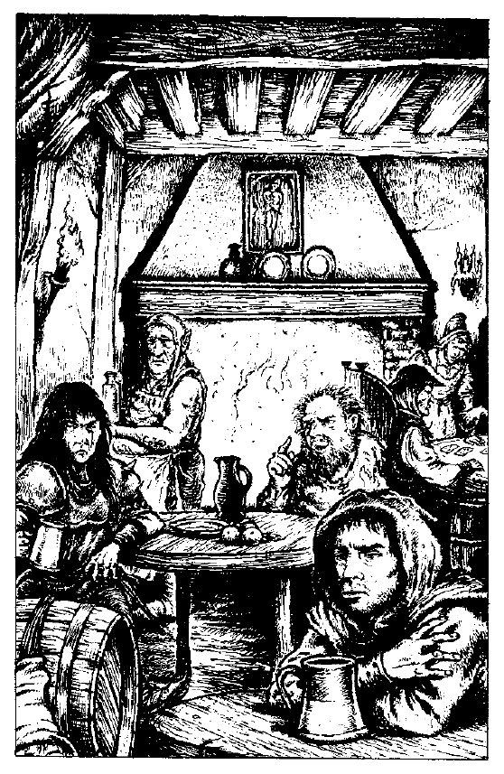 lui pensa personalmente a voi due. Così dicendo indica il randello che porta appeso alla cintura. La gente deve essere dura in questi posti, quindi decidi di ignorare la minaccia; chiedi invece a Kremper se abbia visto passare da queste parti qualcuno che somigli ai tuoi genitori. Lui risponde di no e passa a servire il cliente successivo. Finito lo stufato, ti scoli anche la birra di Layla e cominci a guardarti intorno. Hai bisogno di informazioni. Nella sala ci sono tre tavoli occupati da viandanti solitari: l'ideale per fare qualche domanda, senza dare troppo nell'occhio.