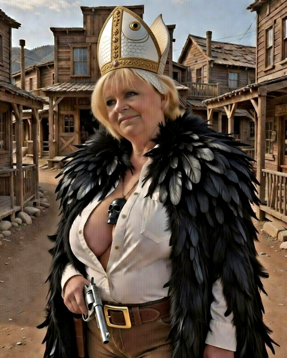 È una bella donna bianca, con uno strano copricapo in testa, a forma di pesce, un teschio nero che le ciondola in mezzo alle grosse zinne e una mantella con piume nere. In una mano stringe un coltello e nell’altra un corvo. Non hai dubbi. Si tratta della Bruja Bianca. Sei tentata di farla secca subito, anche perché indossa - molto profanamente - un cinturone da pistolera. Però è troppo bella per farla secca subito.