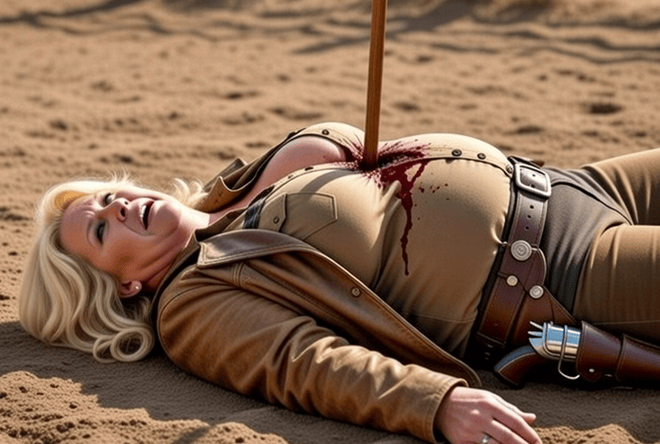Luciana. Un certo Cane Pazzo Charlie comincia a sparare fucilate galoppando come un demonio, beccando Luciana dritta in mezzo alla schiena, con la pallottola che le esplode fuori dalle tette!